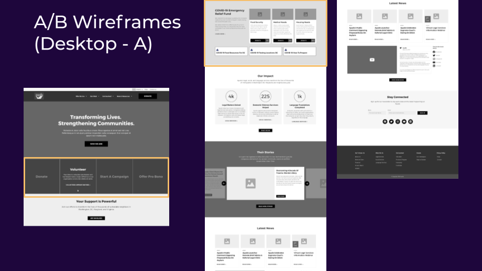 Ayuda was designed to create a community where all immigrants succeed and thrive by providing low-income immigrants resources and volunteers a way to contribute with the cause. Based on research, we observed that the website does not clearly communicate Ayuda’s mission or the impact their services provide, which has the potential to cause less engagement with the organization and lower donation conversions.