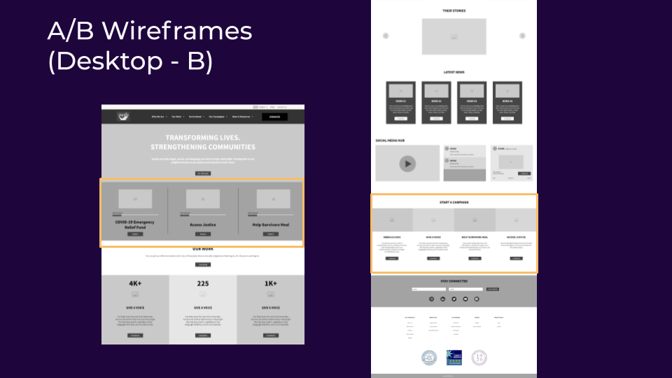 After initial sketches the team created two low-fidelity prototypes in order to test the hierarchy of information on the homepage, and contextual navigation vs conventional. As well as different sections like “Start a Campaign” vs “COVID-19 Relief Fund”. CTAs under hero section vs funding progress in different fundraising events to find out which would have more impact with users and would help the organization reach their business goals.
